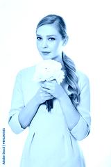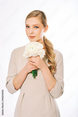 Studio portrait of beautiful young woman wearing beige bodycon dress, holding white buttercup flowers