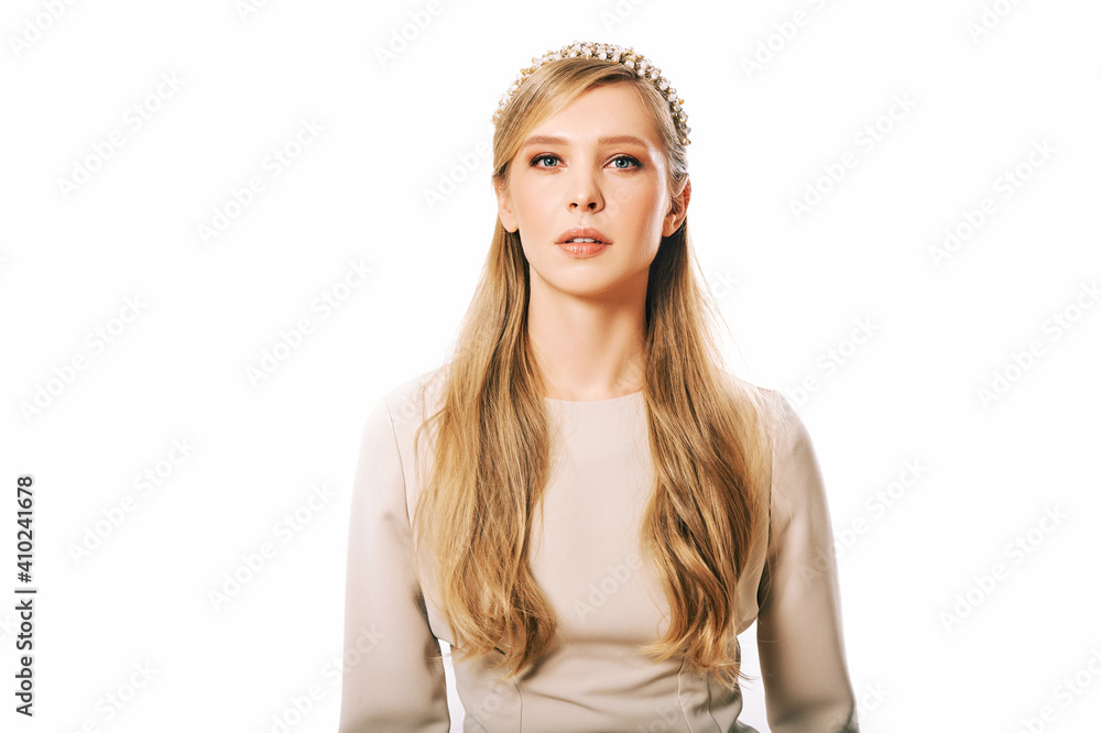 Studio portrait of pretty young woman wearing beige dress and diadem