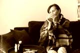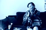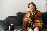 A senior woman has cold and flu, sneezes and has runny nose, wipes her nose with a paper tissue sitting covered blanket on the couch. Viral disease concept