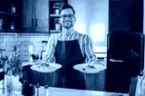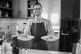 Young smiling chef showing freshly home made tomato and basil pasta
