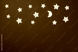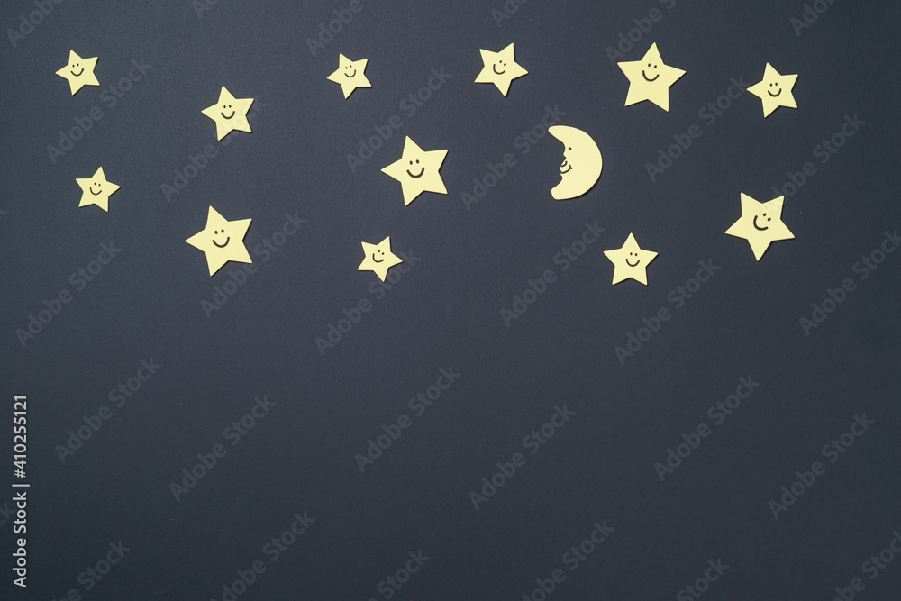 Elements in shape of yellow stars and smiling moon on paper black background. Greeting card design. Flat lay. Top view