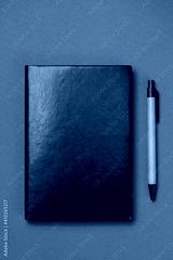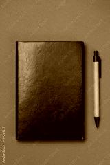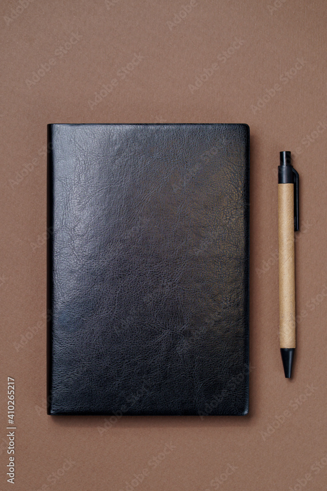 Black leather notebook on a paper brown background, notepad mock up, top view shot