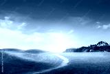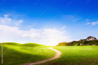 spring landscape with green grass, road and clouds