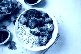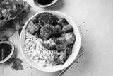 Top view of healthy tofu bowl with broccoli and rice on white background. Vegetarian food concept
