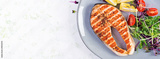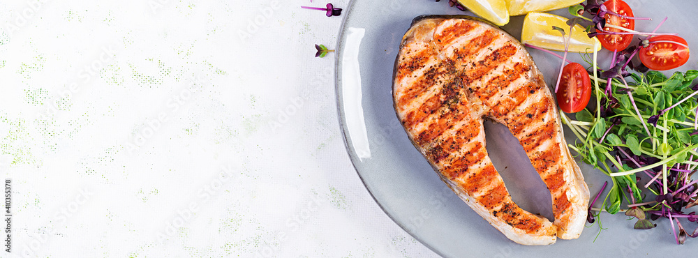 Salmon. Salmon fish steak grilled and tomatoes salad with microgreens. Healthy food. Top view, overhead, copy space.