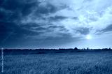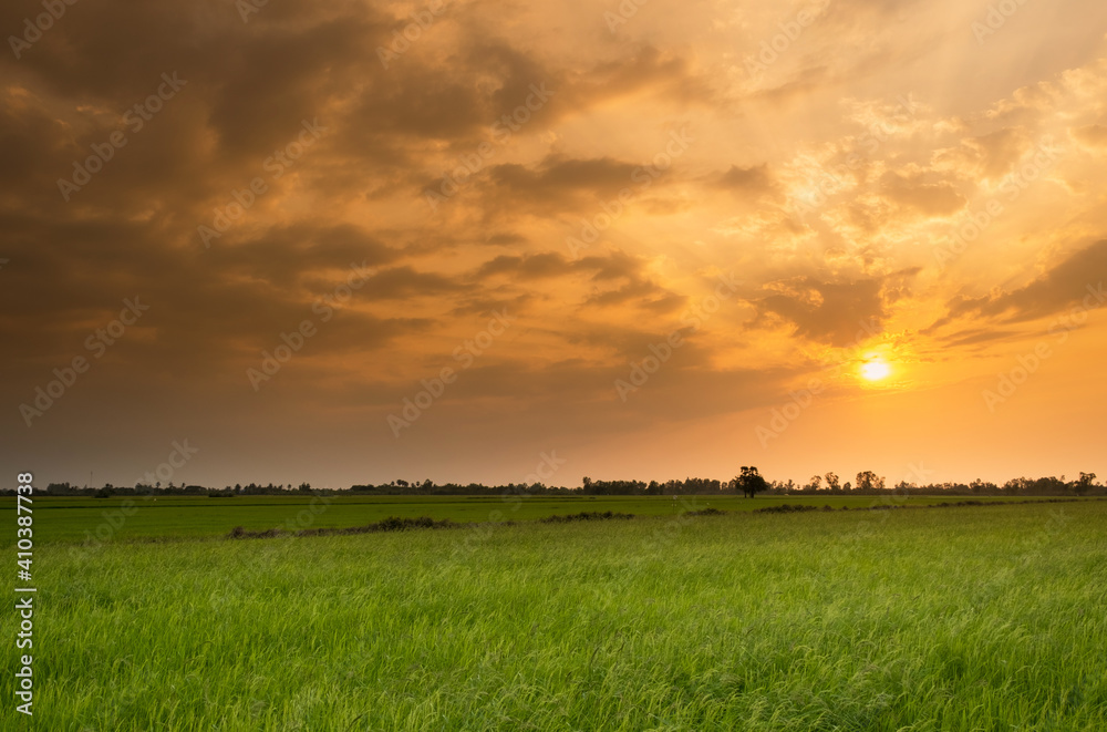 Natural beautiful scenic landscape of sunset at cultivated land and rice field agriculture of countryside in evening.