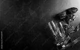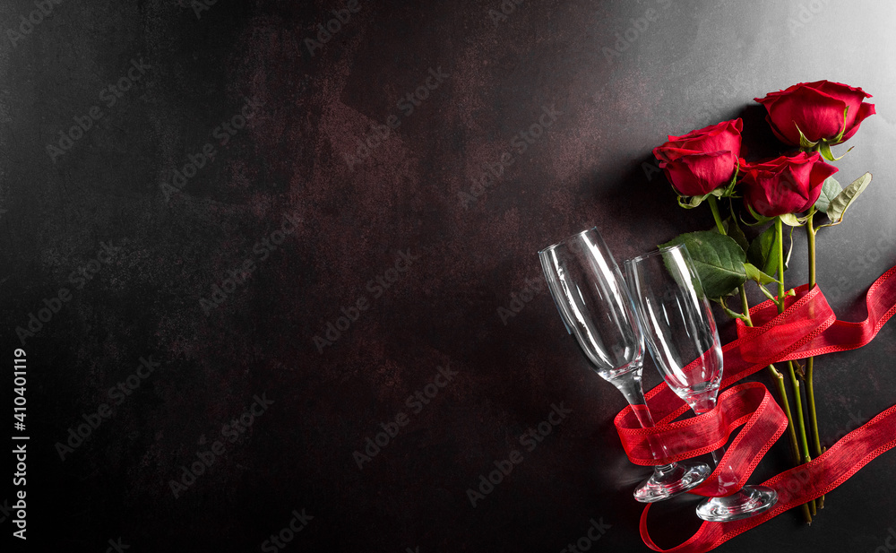 Love and Valentine's day concept made from champagne glasses and rose on dark stone background. Top view with copy space, flat lay.