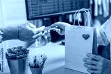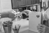 Man with credit card pays at the checkout buying gift in a female clothing store.