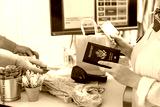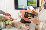 Man holding out american passport with boarding pass to cashier in female boutique store at the airport duty free.