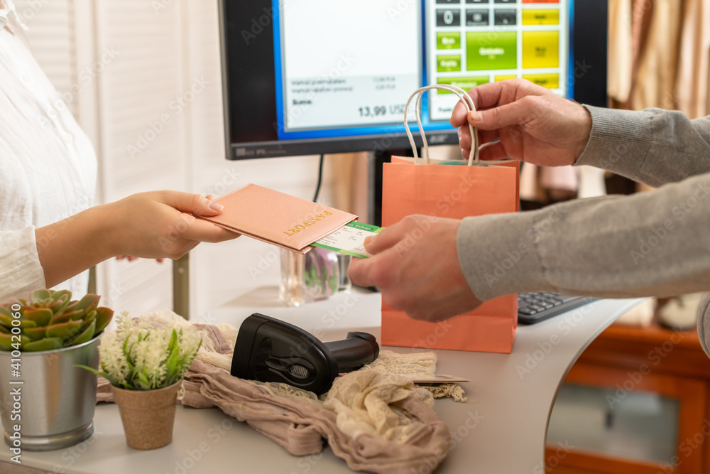 Woman holding out passport with boarding pass to cashier in female boutique store at the airport duty free.