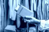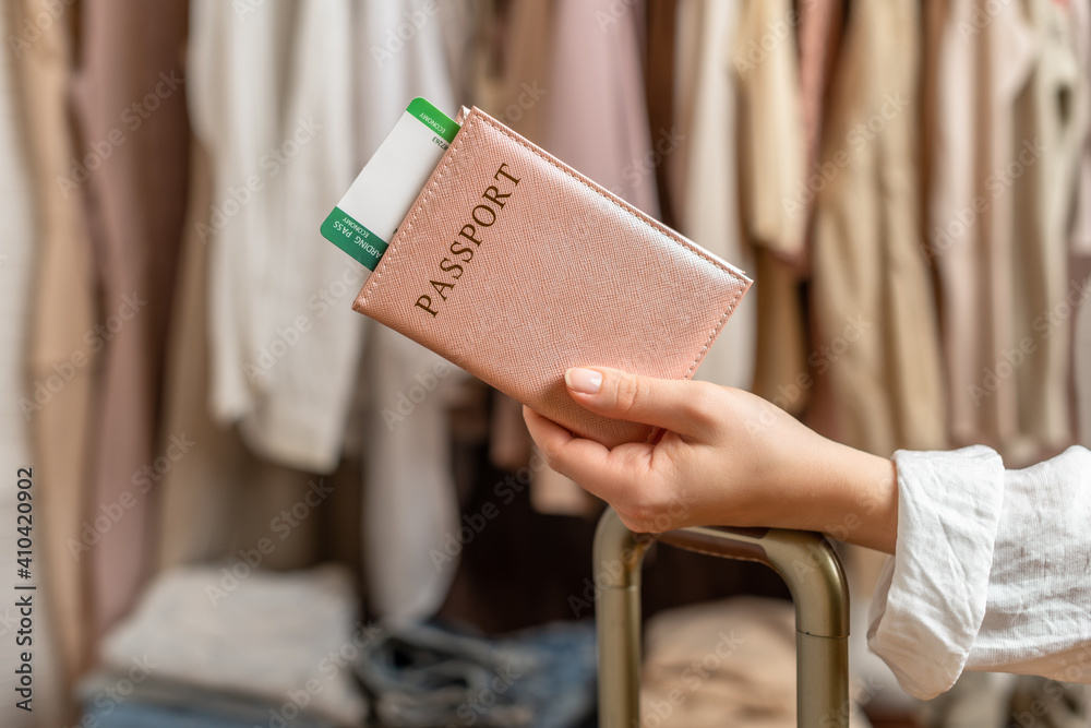 Woman with suitcase holding passport with boarding pass in female boutique store at the airport duty free