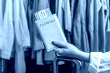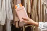 Woman with suitcase holding passport with boarding pass in female boutique store at the airport duty free