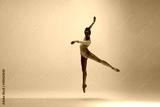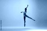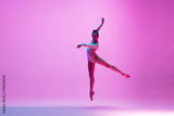 High above. Young and graceful ballet dancer on pink studio background in neon light. Art, motion, action, flexibility, inspiration concept. Flexible caucasian ballet dancer, moves in glow.