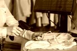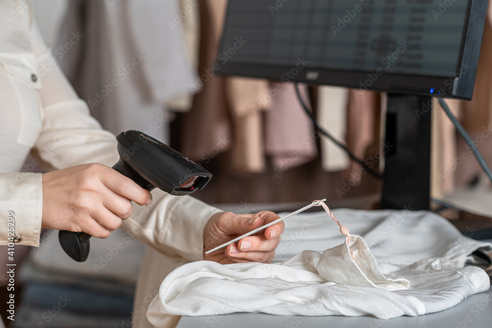 A warehouse woman employee accepts clothes using barcode scanner reading a bar code from price tag of female blouse and adds to the computer base