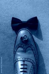 Wedding preparation lay flat with rings bow tie and shoe