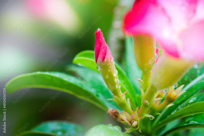 Close-up by macro lens of water drops after rain in morning on Adenium obesum buds, selective focus shot of water drop.