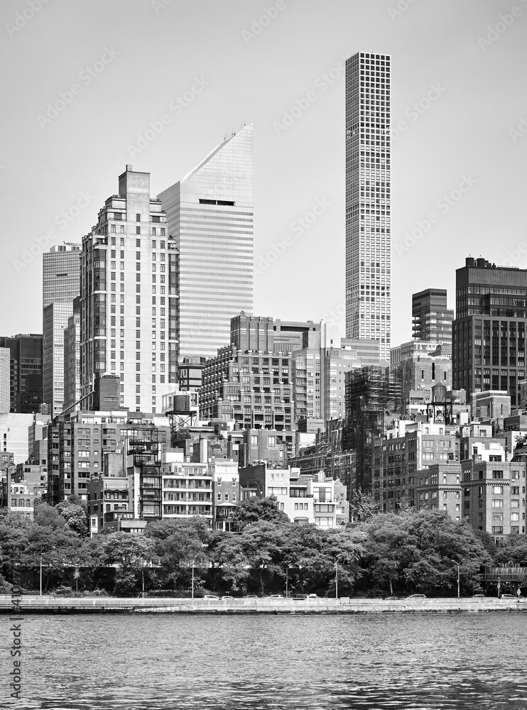 Black and white picture of New York City diverse architecture, USA.