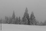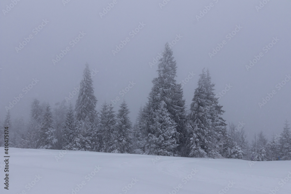 Frosted and now-covered trees in the fog. Misty weather during a snowstorm in Beskid mountains