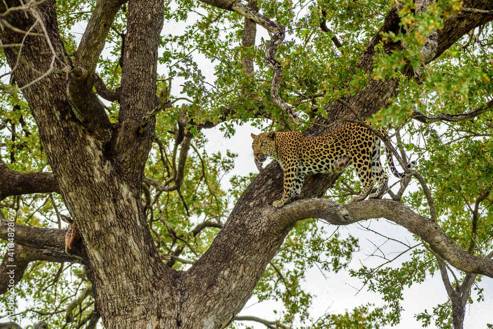 A leopard hiding on a tree in Kruger NP in South Africa.