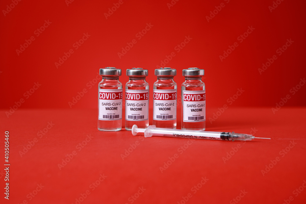 Covid-19 vaccine. Vial and syring with coronavirus Sars-Cov-2 jab Injections. Vaccine shortages setback for Its immunization race. Close up Ampoules dose on red background and place for text.