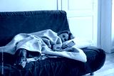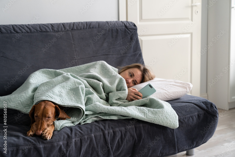 Sad woman lying on sofa with dog, using smart phone in hands wait for boyfriend call or text, feels depressed. Thoughtful female think about relationships problems. Mental health, loneliness concept.