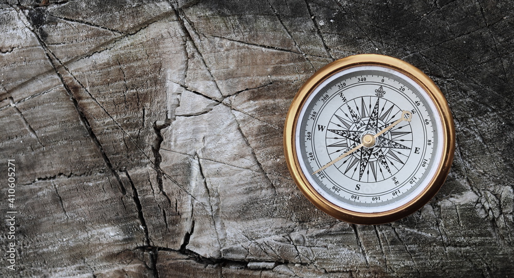 round compass on natural wooden background as symbol of tourism with compass, travel with compass and outdoor activities with compass