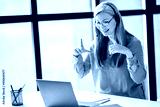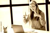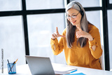 Friendly Asian senior charming woman uses a laptop for virtual online meeting, gray-haired business lady communicates online on a video meeting, sitting in modern office, online communication concept