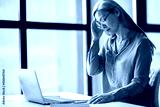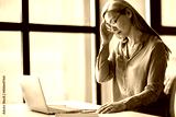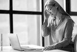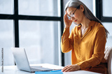 Frustrated asian senior gray-haired business woman or tutor, is tired uses laptop for working online, or conduct distance teaching, closed her eyes, headache, need a rest