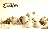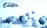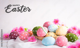 Happy easter decoration concept! Beautiful easter eggs with pink flower on bright white wooden background.