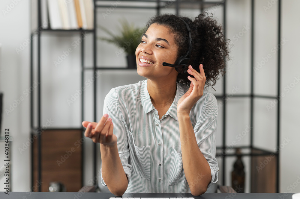 Young smiley African American female customer service agent in a headset, touching microphone, talking and looking away, enjoying her work, and feeling happy to help clients and satisfy their needs