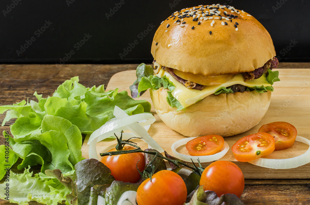 hamburger cheese with vegetables on wooden plate