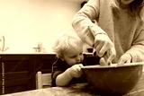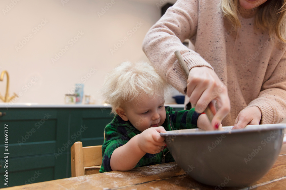 Mother and child mixing ingredients in a bowl in the kitchen together.