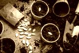 Planting seed into peat pot. Sowing pumpkin seeds in soil. Agricultural activity and gardening at spring. Plant nursery