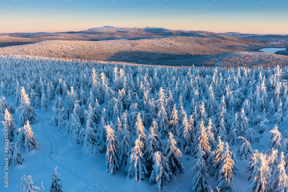 Panoramic landscape of Jizera Mountains, view from peak Izera with frosty spruce forest, trees and hills. Winter time near ski resort, blue sky background. Liberec, Czech Republic, Northern Bohemia