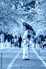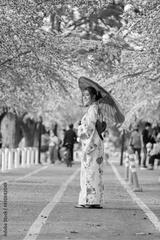 woman in yukata (kimono dress) holding umbrella and looking sakura flower or cherry blossom blooming in garden