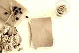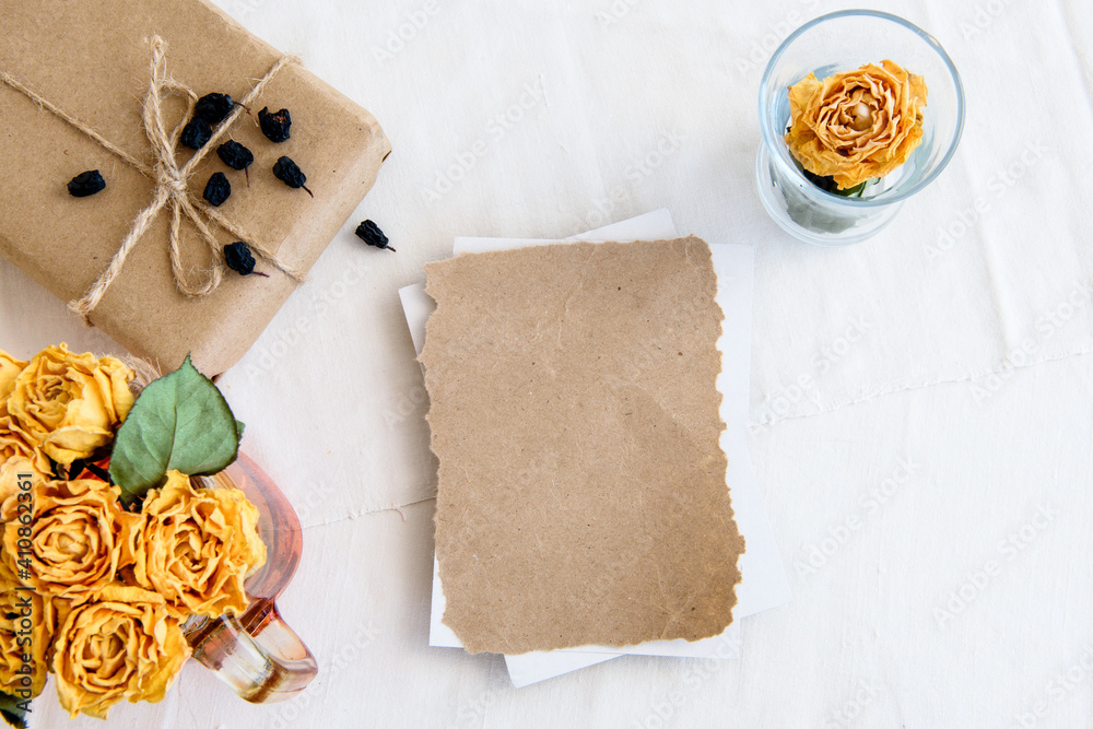 An empty vertical greeting card, a string of pearls and dried flowers isolated on a white table background. Top view blank for invitation