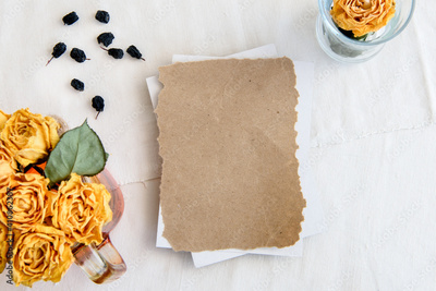 Vintage white background and blank postcard - white background, yellow roses, eucalyptus sprig and copy space. A romantic greeting card.