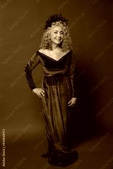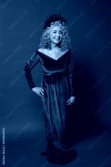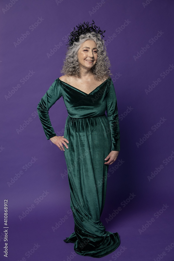 Studio portrait of an elderly woman 60-65 years old in a beautiful dress with a crown on her head on a colored background. Concept: stylish pensioners of model appearance, active life.