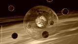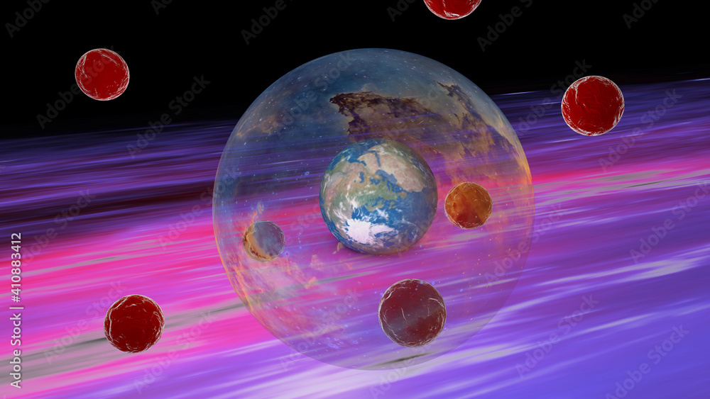 3D rendering of the planet Earth in a protective sphere with nebulae and red particles around it