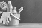 House cleaning product on wood table with blue background, home service or housekeeping concept