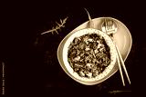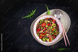 Tabbouleh with quinoa. Tabbouleh salad - traditional Middle Eastern cuisine. Vegetarian salad with quinoa, tomato, avocado, green herbs and lemon juice. Vegan and vegetarian meal. Top view, above
