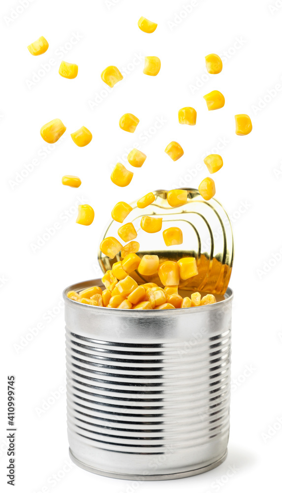 Canned corn flies out of a metal can on a white background. Isolated