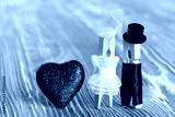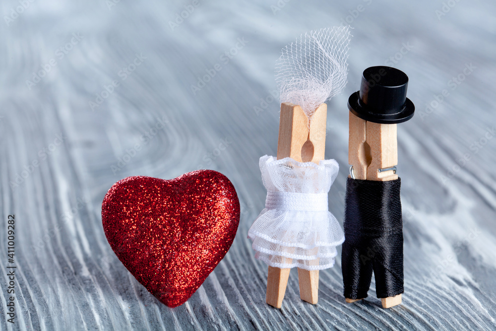 Just married romantic poster. Wedding invitation and valentines day funny postcard. Toy clothespin man woman and read heart. Groom in black suit, bride white dress.