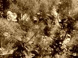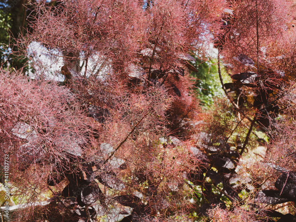 (Cotinus coggygria 'Pourpre royal') Arbre à perruques ou barbe de Jupiter à petites fleurs vert jaune sur des long pédicelles pourpres entourés de panicules plumeuses