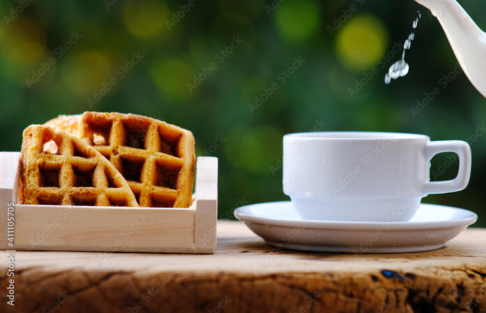 hot coffee and tea with bakery in the morning on wood table background and space