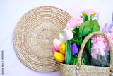 basket with flowers on white background and space
