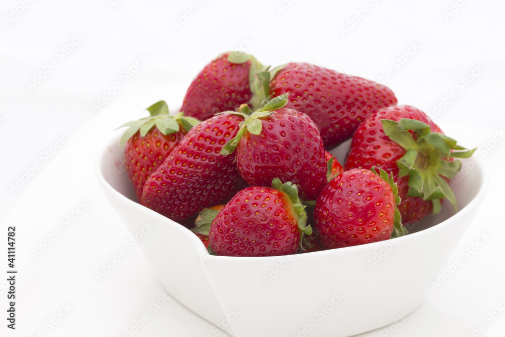 White bowl filled with fresh strawberries.