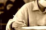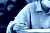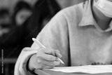 Students wearing mask for protect corona virus or covid-19 and doing exam in classroom with stress