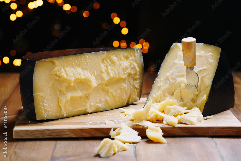 Medium hard cheese head parmesan on wooden board, with cheese parmesan knifes.