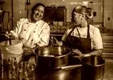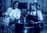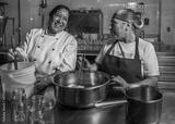 Two latin women kitchen workers preparing a sauce. Woman smiling while stirring container in restaurant,